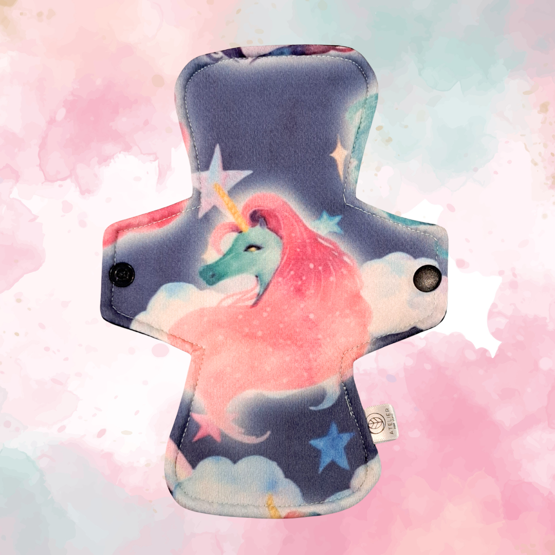 Laissez-vous emporter par la magie avec le motif Licorne en Folie! Ces serviettes hygiéniques lavables, décorées d'une licorne dynamique et pleine de couleurs éclatantes, apportent une touche de fun et de fantaisie à vos journées. Parce qu’on peut être à la fois pétillante et écoresponsable, avec un peu de folie dans l'air!