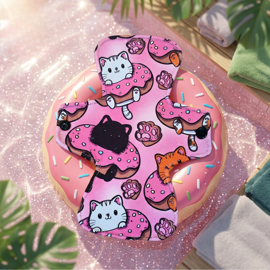 Gourmand, drôle et full attachant, ce motif te rappelle que pendant tes règles, t’as le droit de te rouler en boule… dans le confort, pas juste dans les beignes. 🍩💖🐾