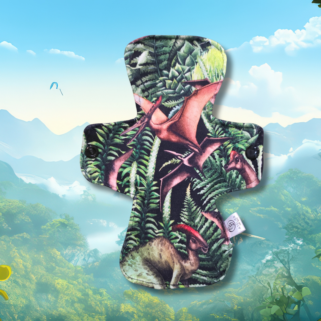 Entre feuillage dense et vibes jurassiques, Règle-O-Saure te plonge dans un univers préhistorique où ton cycle devient une aventure sauvage… mais stylée! 😏 Même quand ton utérus rugit, ce motif funky te rappelle que tu peux rester confortable, colorée et un brin farouche.
